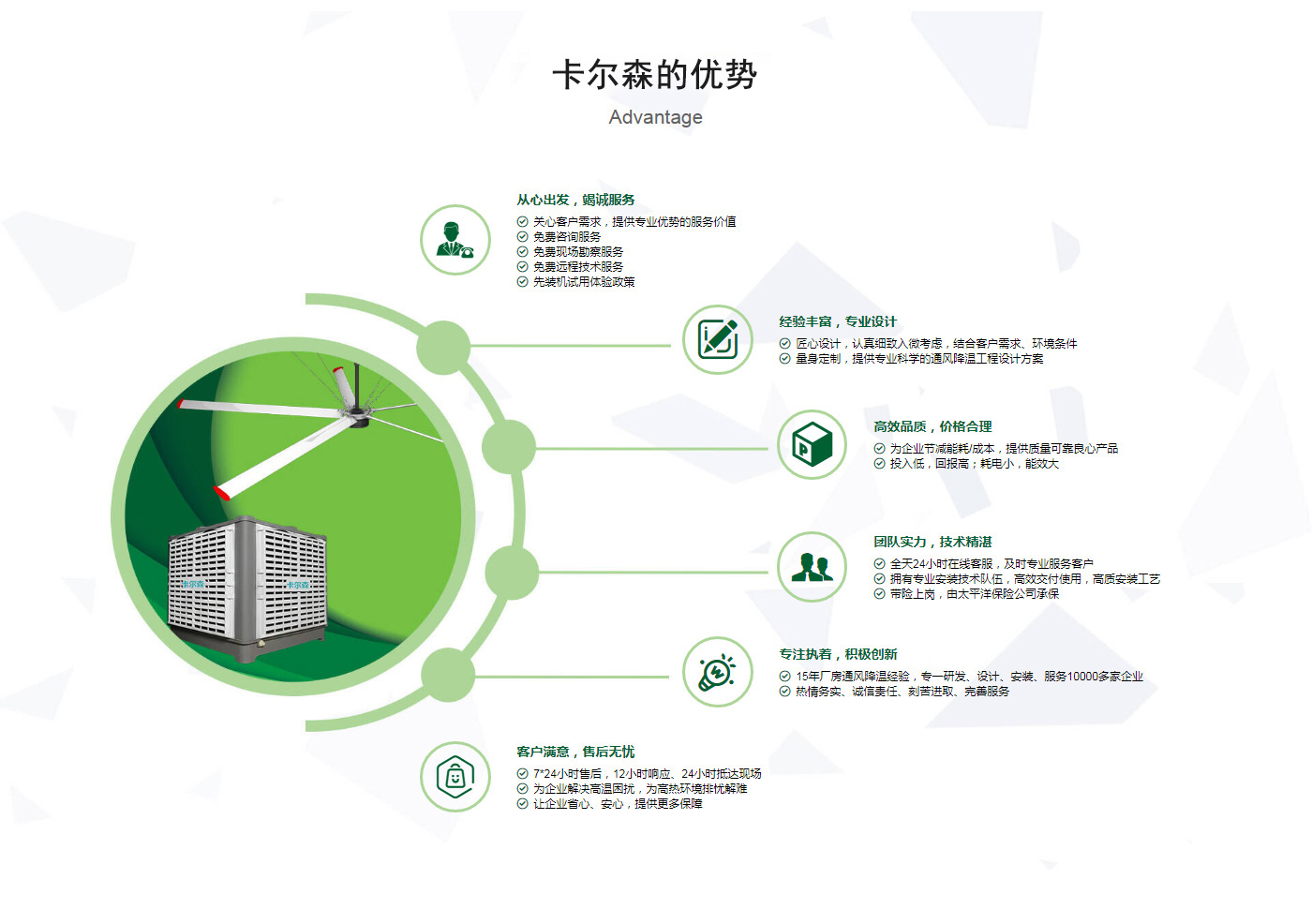 應(yīng)用范圍: 適用于高溫或有異味的車間:熱處理廠、鑄件廠、塑料廠、鋁型材廠、制鞋廠、皮件廠、電鍍廠、印染廠等各種化工廠等。 適用于勞動(dòng)密集型企業(yè):服裝廠,各類裝配車間,網(wǎng)吧等。 適用于需要降溫又需要一定濕度的場(chǎng)所:棉紡廠、毛紡廠、麻紡廠、織布廠、化纖廠、經(jīng)編廠、加彈廠、針織廠、絲織廠、襪廠等各類紡織廠。 適用于:倉(cāng)儲(chǔ)物流領(lǐng)域、園藝溫室大棚通風(fēng)降溫、畜牧場(chǎng)降溫等場(chǎng)所。 全國(guó)服務(wù)熱線:13960350919